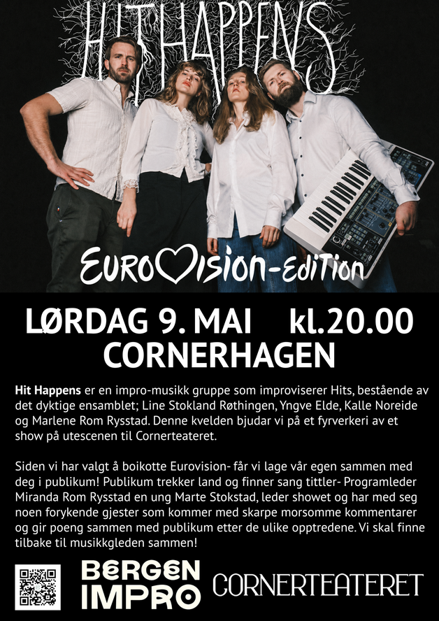 Hit Happens er en impro-musikkgruppe som lager helt nye lĂ„ter â live pĂ„ stedet â basert pĂ„ publikums forslag. Denne kvelden skrur vi opp nivĂ„et og inviterer til vĂ„r helt egen Eurovision-utgave, der ALT kan skje.